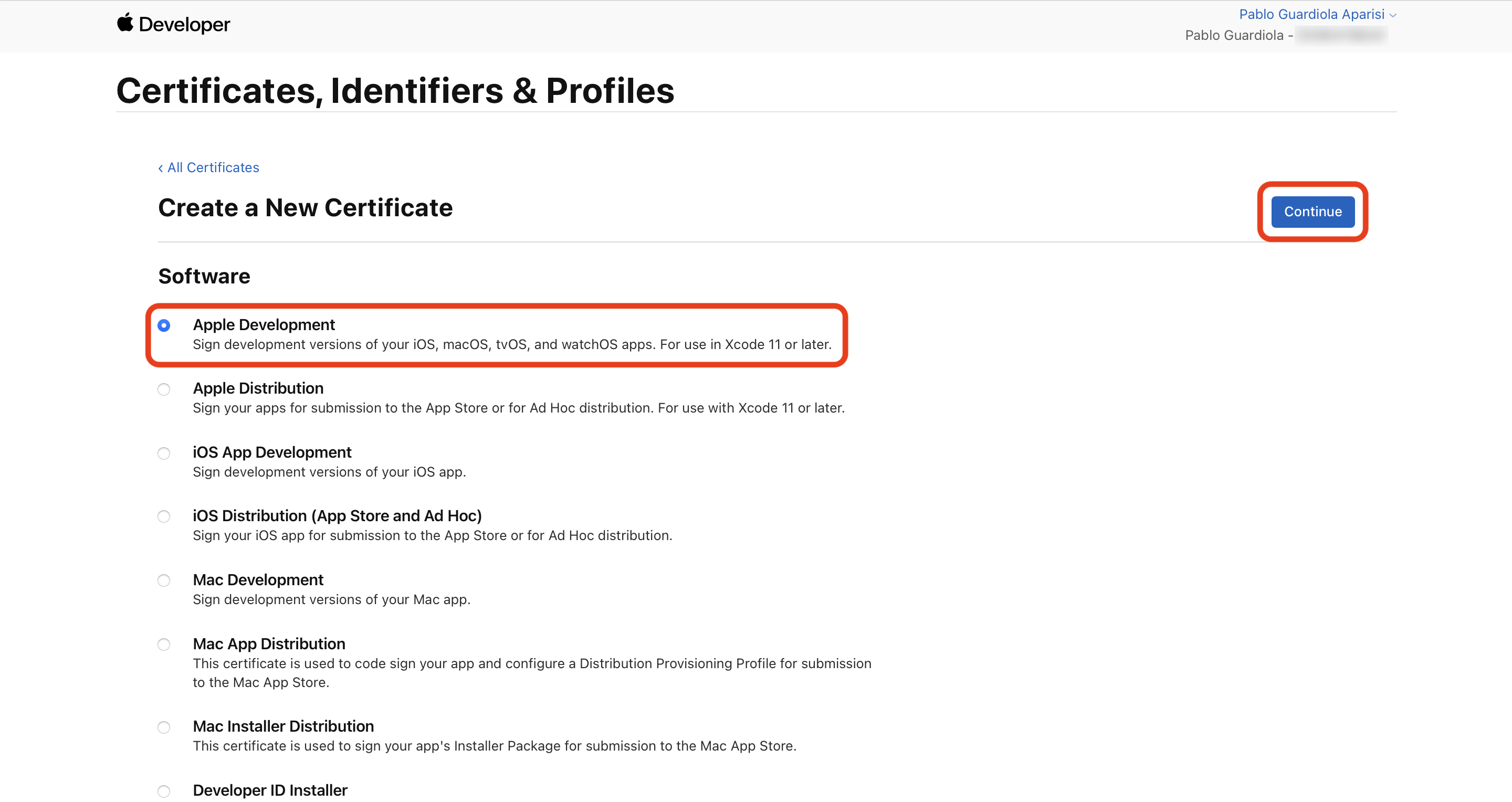 For this example we will select a development certificate. To create a distribution certificate, the only difference will be that we will select the second option (Apple Distribution).