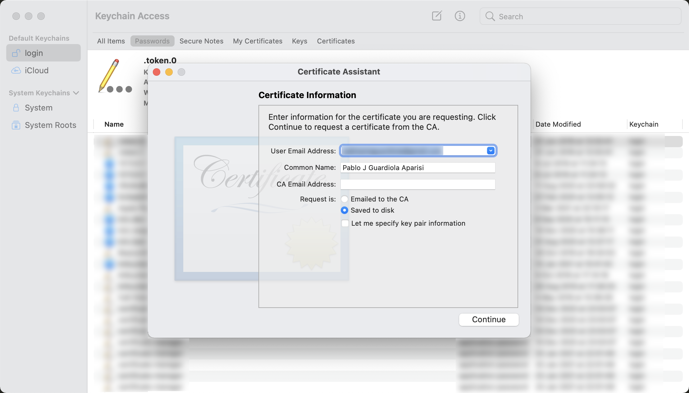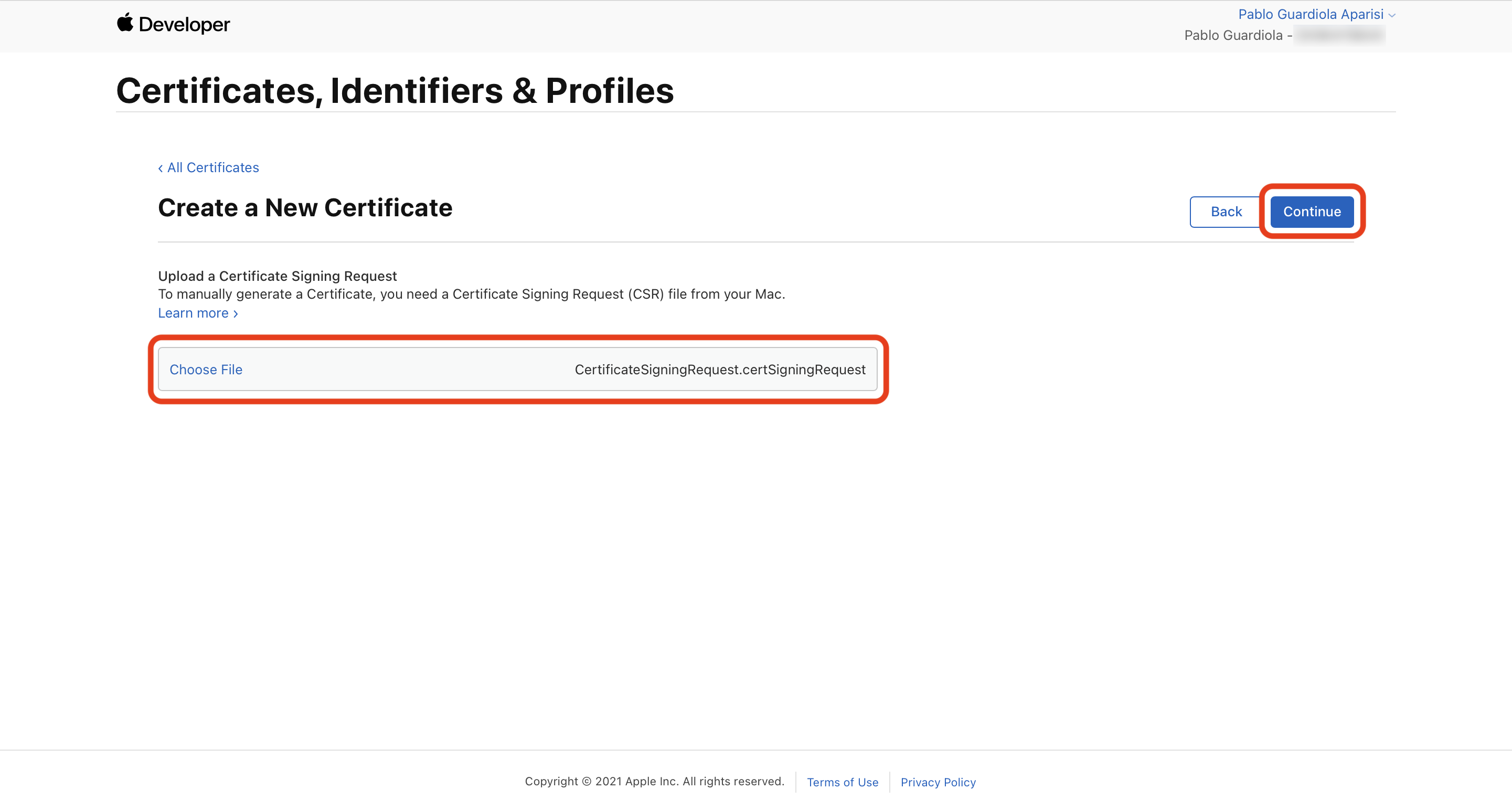 We will select the Certificate Request that we just created (this is used for development and distribution) and click on Continue.
