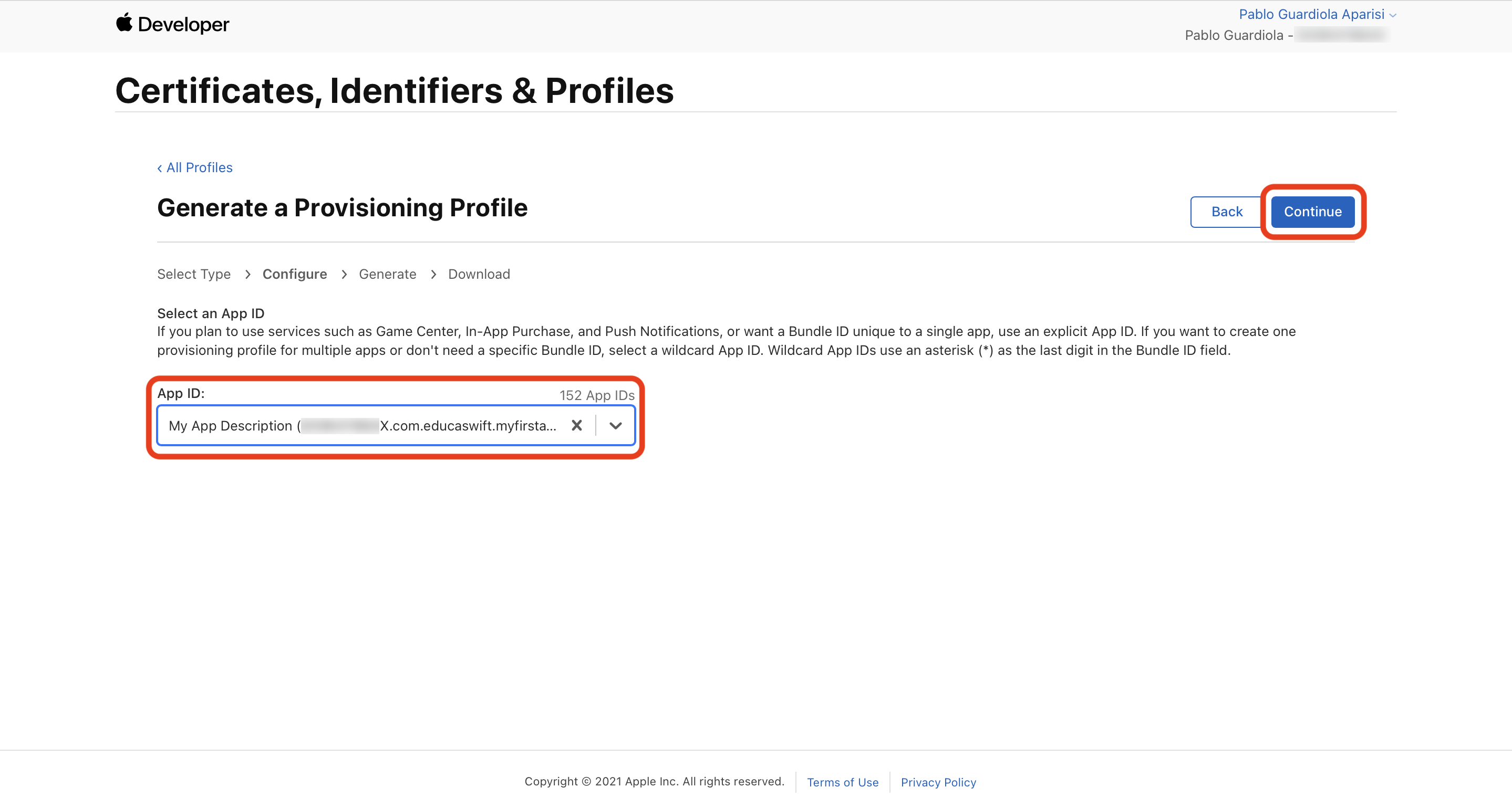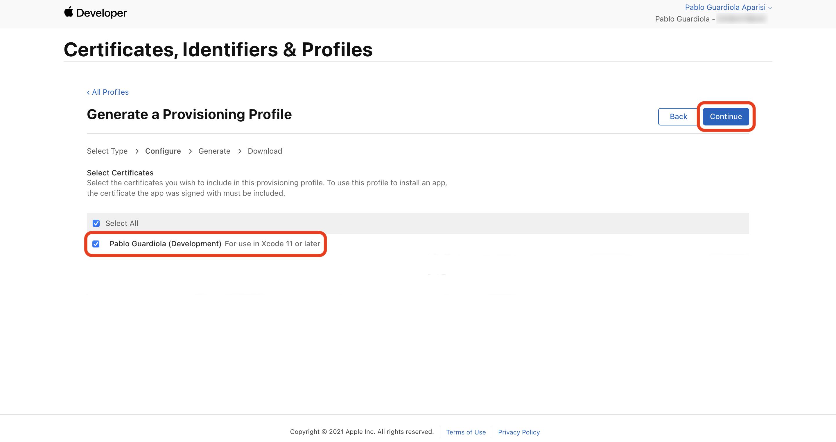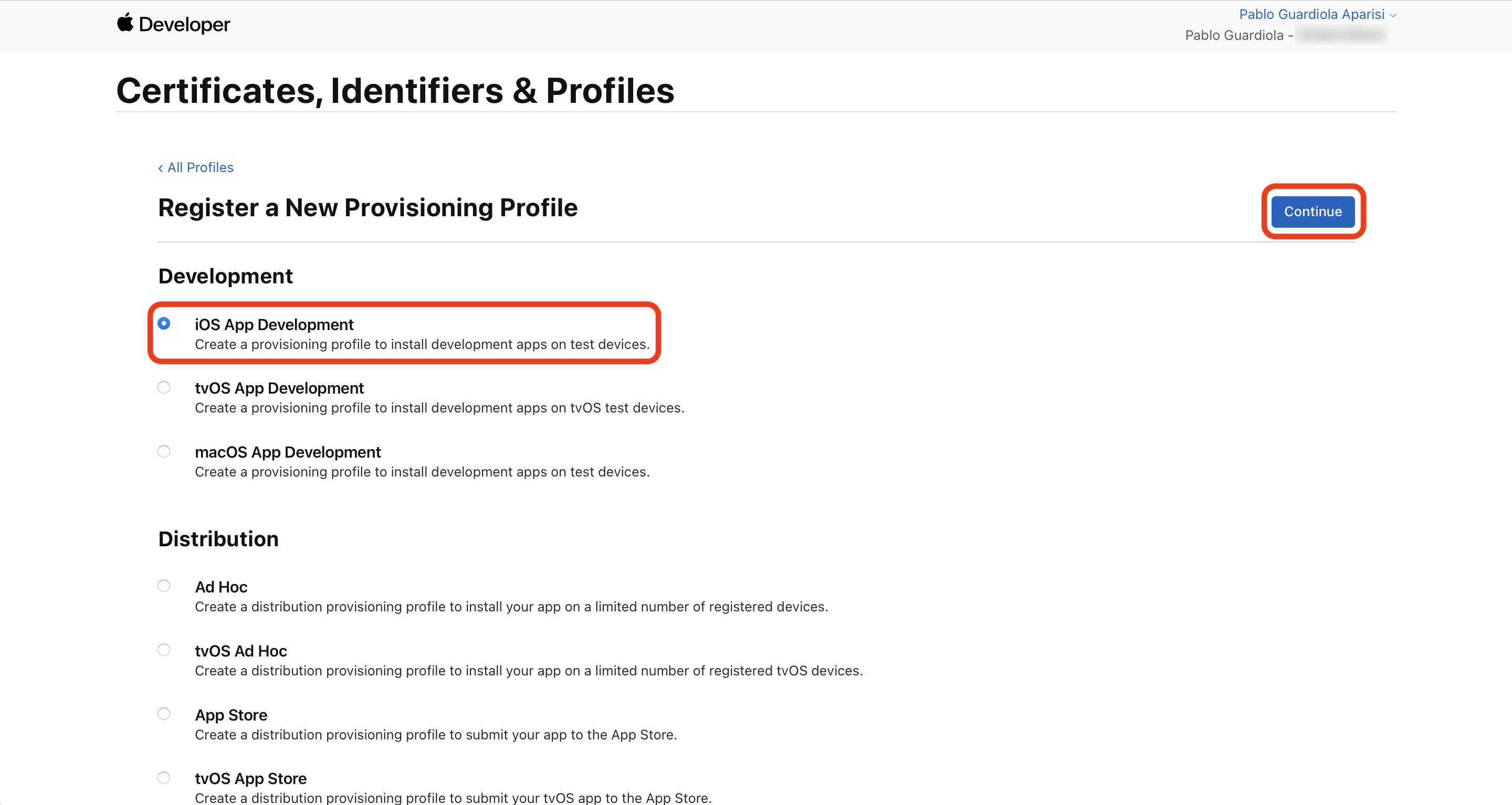 Lastly, we will create the Provisioning Profile, in this case for development.