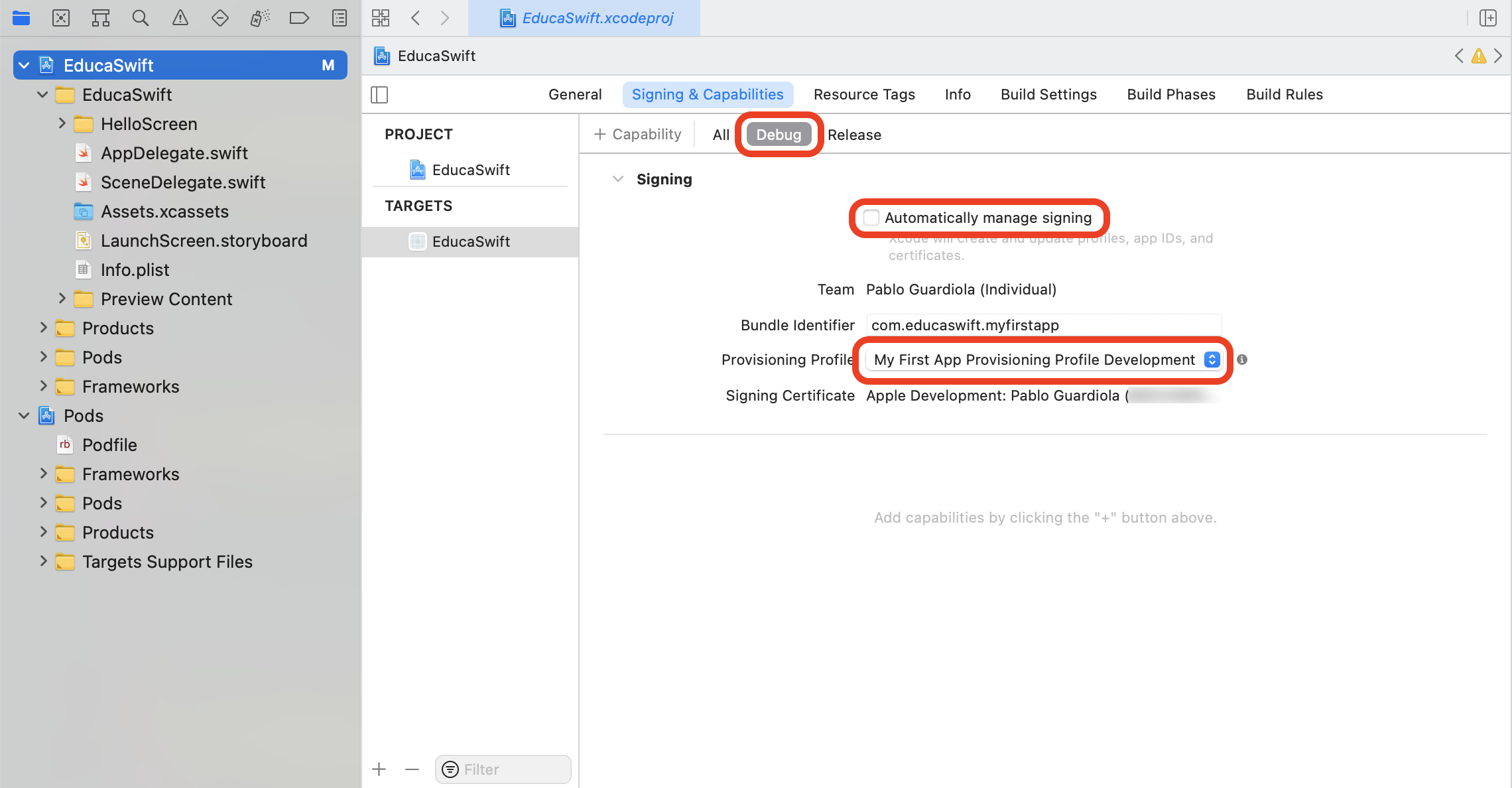 Once downloaded, open Xcode and sign your app without selecting Automatically manage signing, using the Provisioning Profile we created.