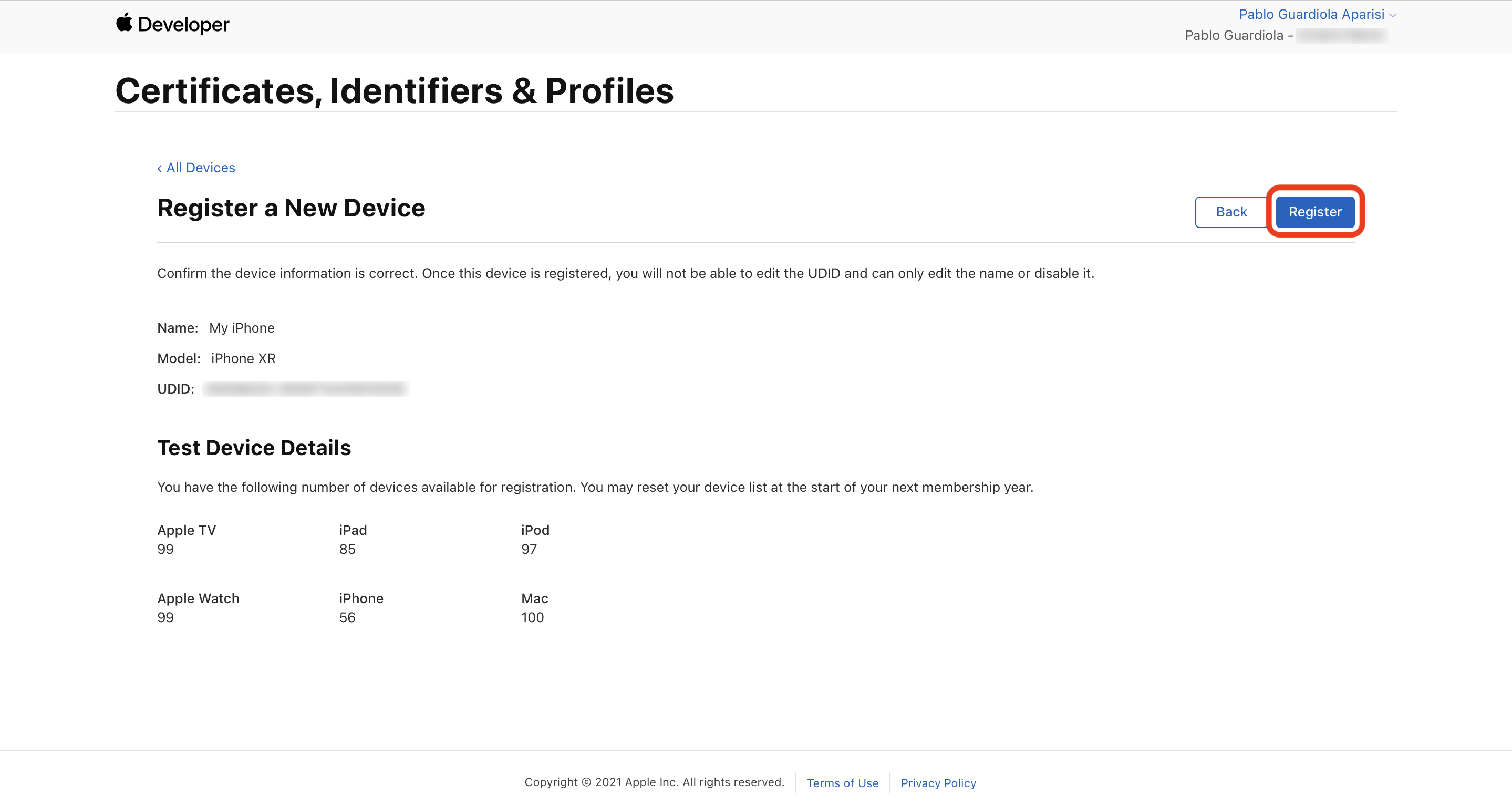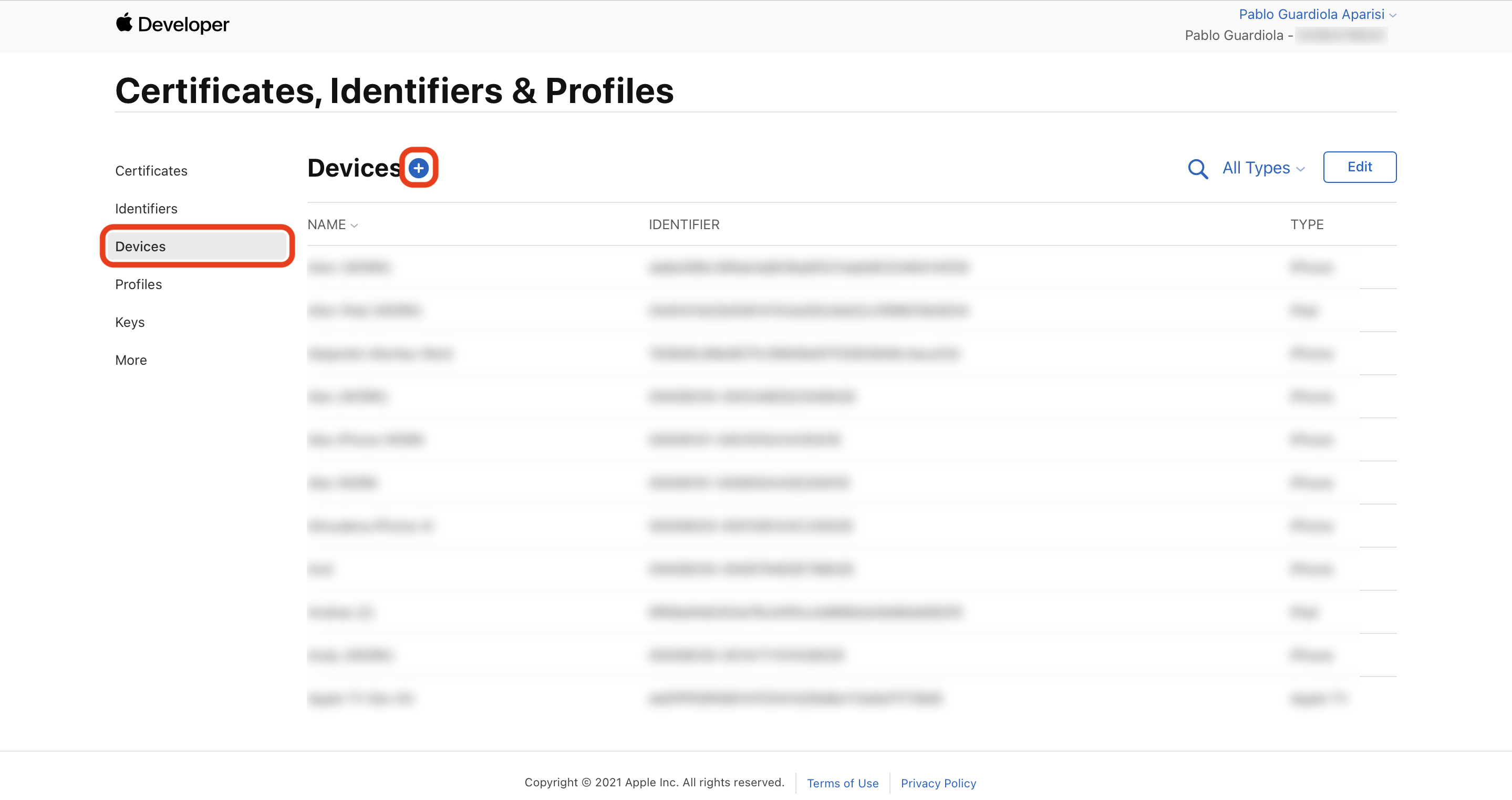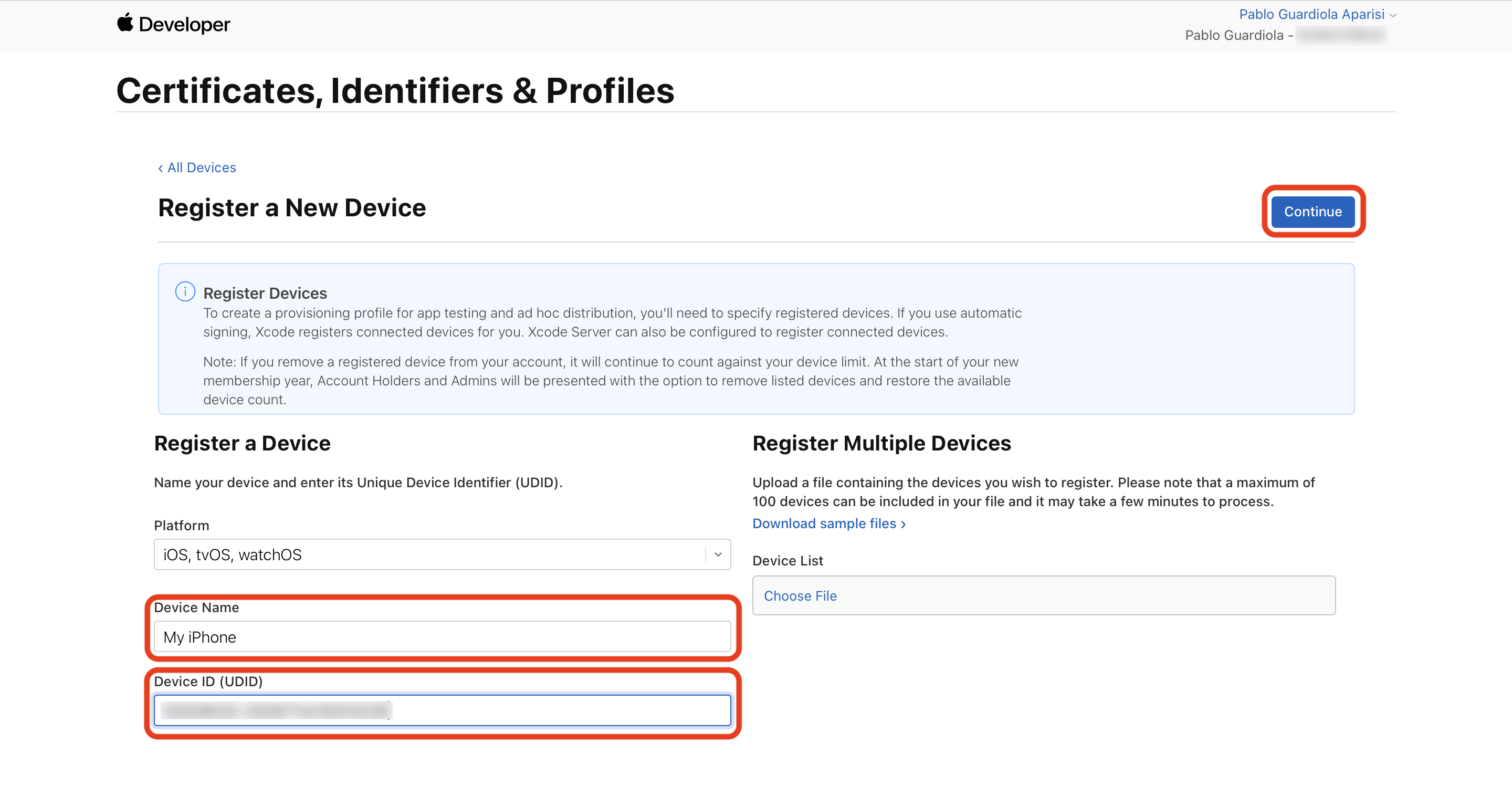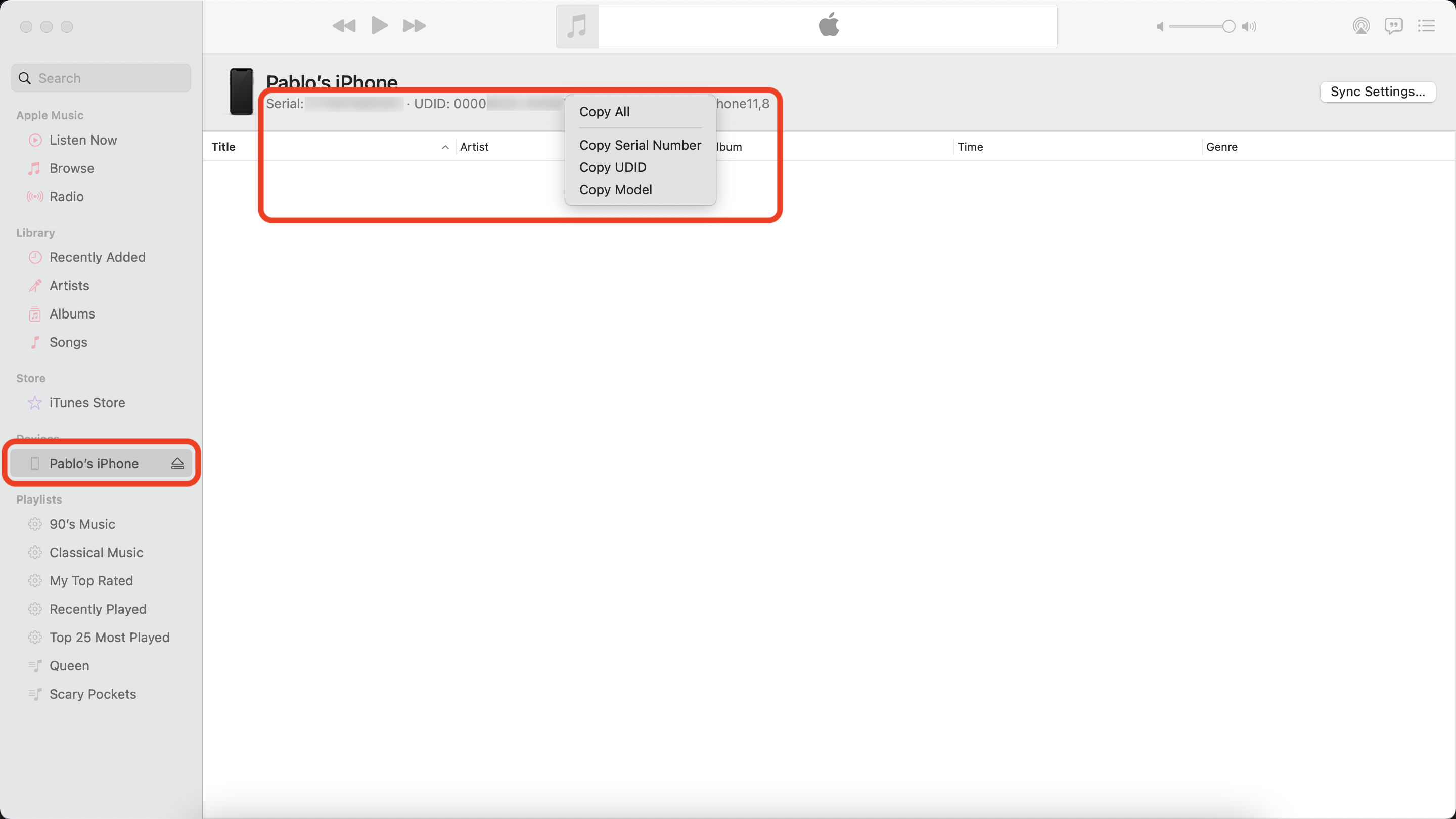 All devices on which we want to install our app must be registered. For this, we need the device’s UDID, which can be obtained by connecting it to our Mac with the Music app open. Select your device and click the text just below the name until you see the UDID, which you can copy by right-clicking.