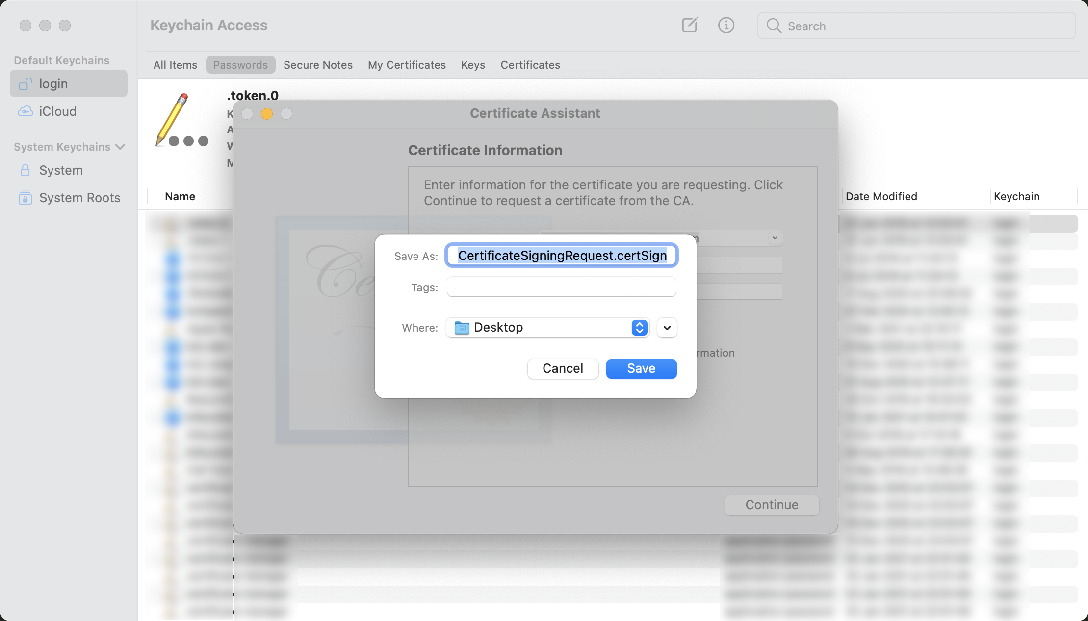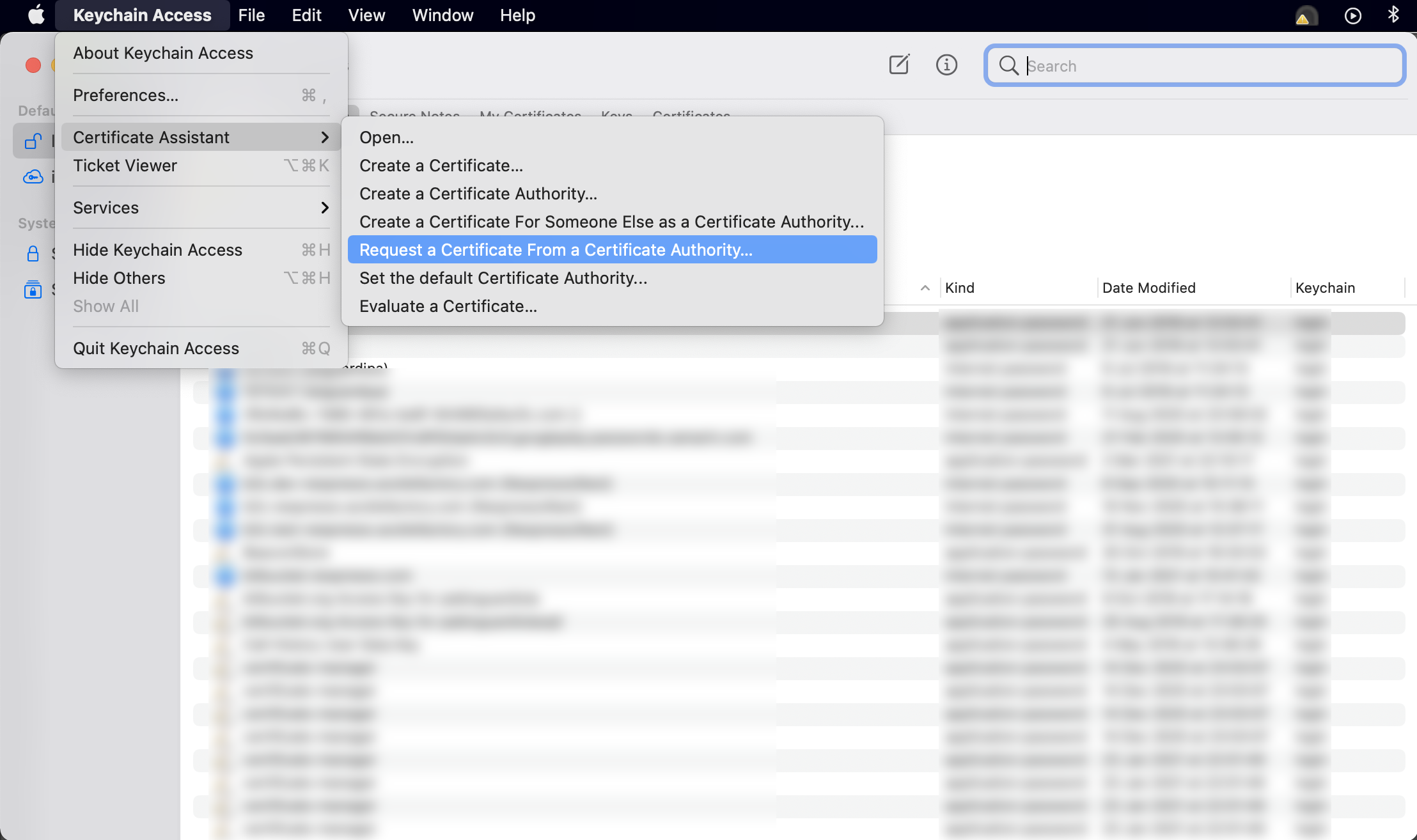 From the Mac app Keychain Access, we will create a Certificate Request by clicking Keychain Access -> Certificate Assistant -> Request a Certificate From a Certificate Authority.