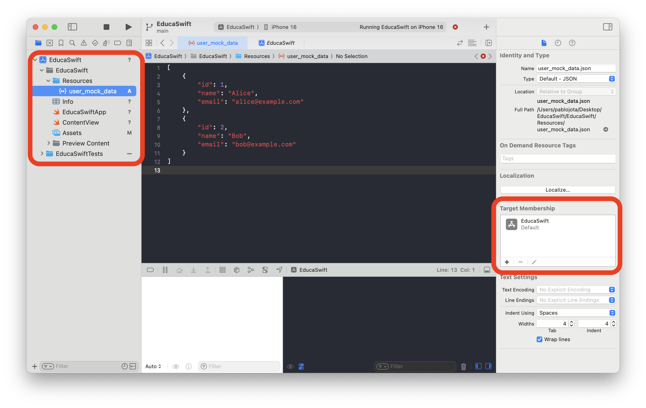 To include this file in the main bundle, drag and drop user_mock_data.json into your Xcode project, we created Resources folder just to have a better organization. Make sure that the file is added to the appropriate target so it will be accessible at runtime.