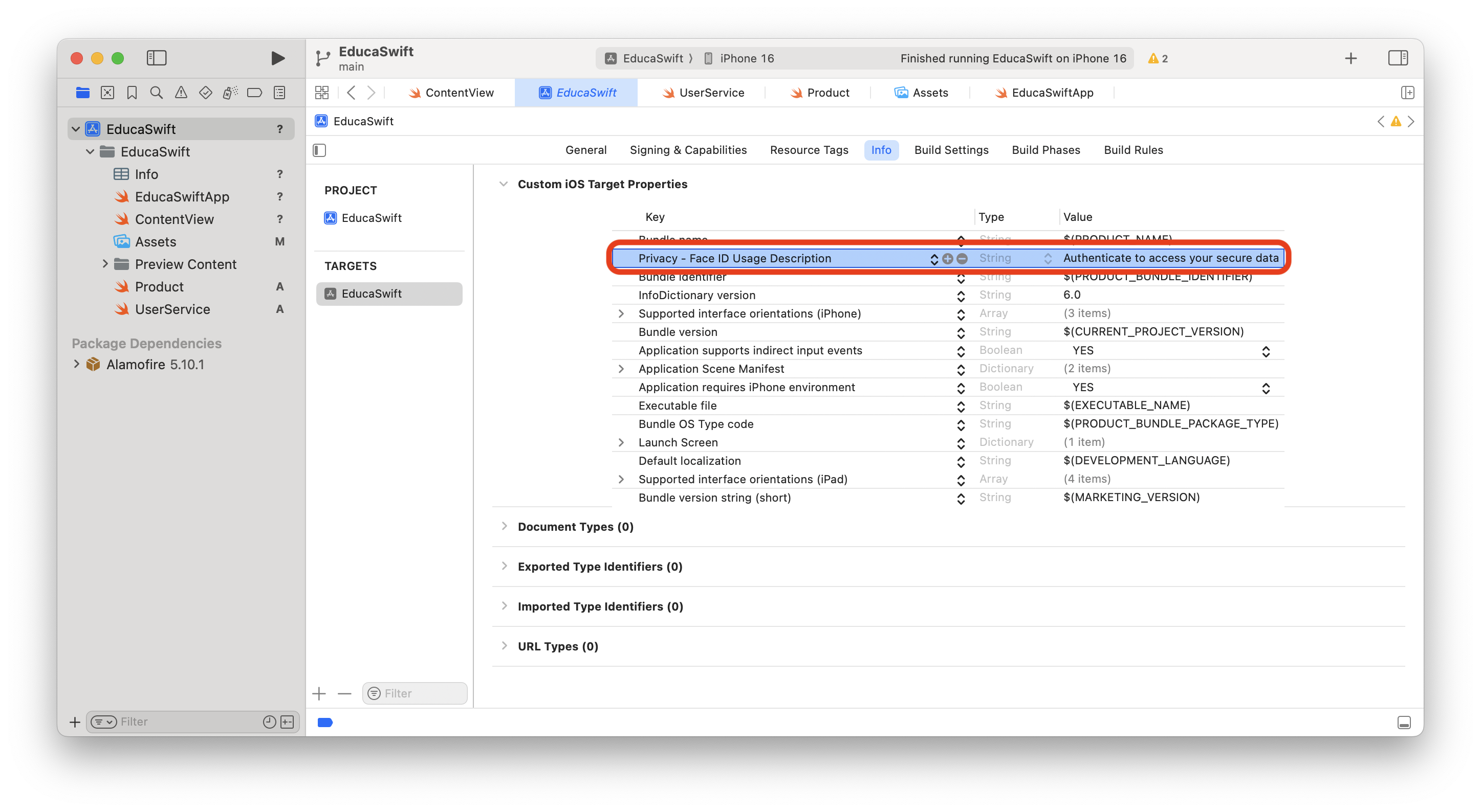 Before start using LocalAuthentication we need to add a new key to our info.plist file: NSFaceIDUsageDescription. This is just a string that should describe the use we are going to give it in our app:
