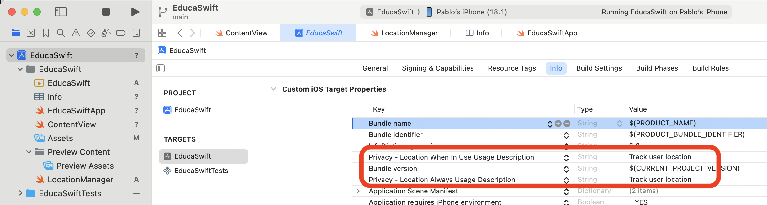 To manage this let's create LocationManager, this object will ask for user permission and start location updates, so when the user moves around, we'll get the new location coordinates.