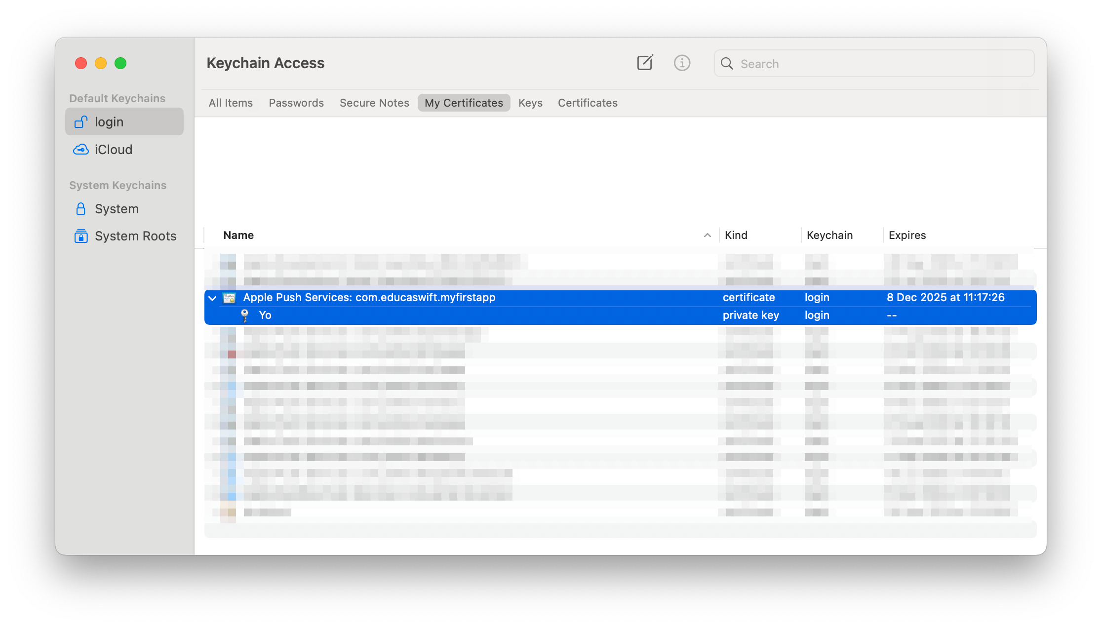 After downloading your new certificate, double-click on it to install it in your machine. Then open KeyChain App and find it: