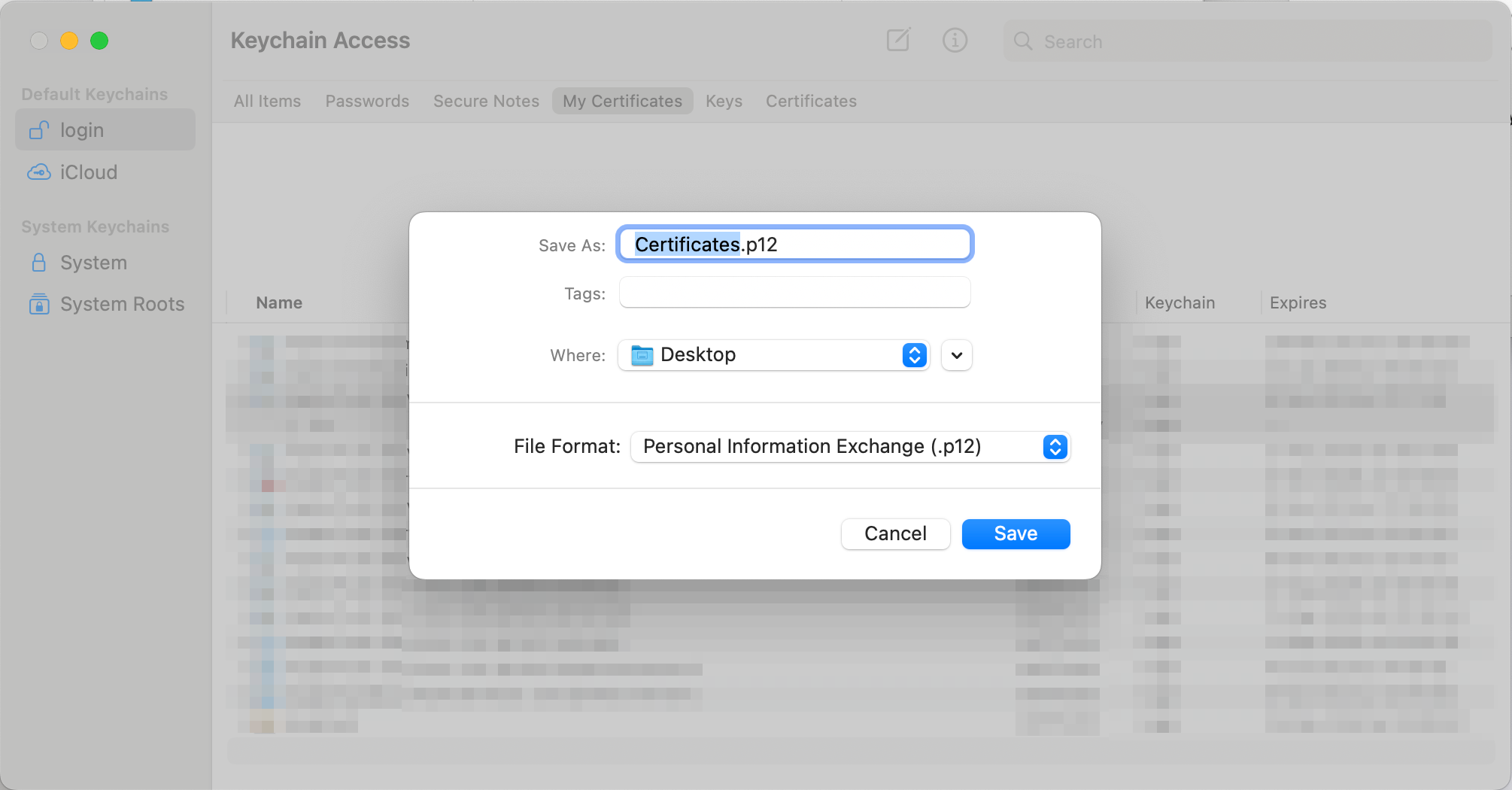 Expand your certificate, select both items and right-click on them to select Export 2 items... option. It will ask you to provide a password (you can leave it empty), and then, it's possible that it will ask you to introduce your Mac user password.